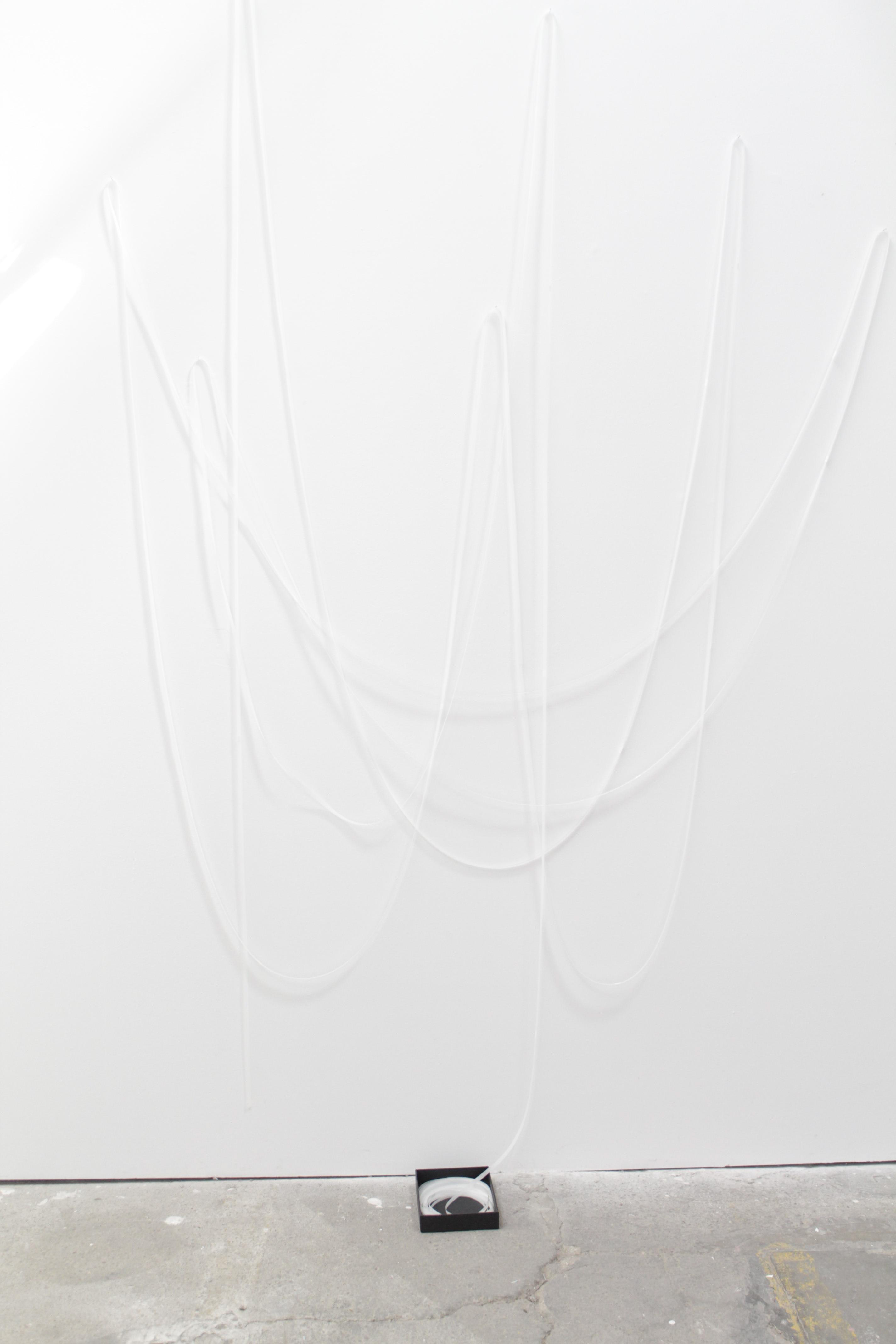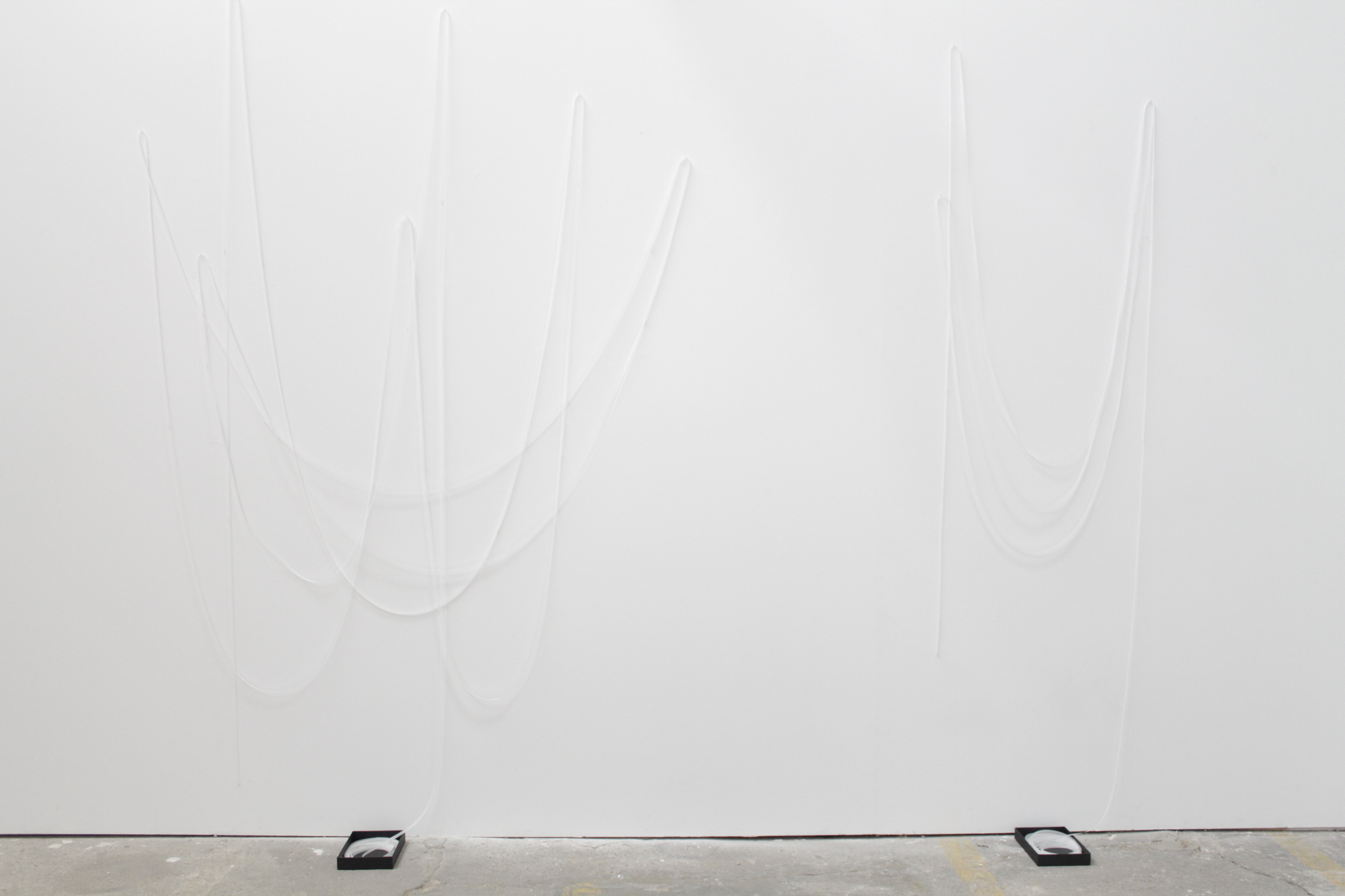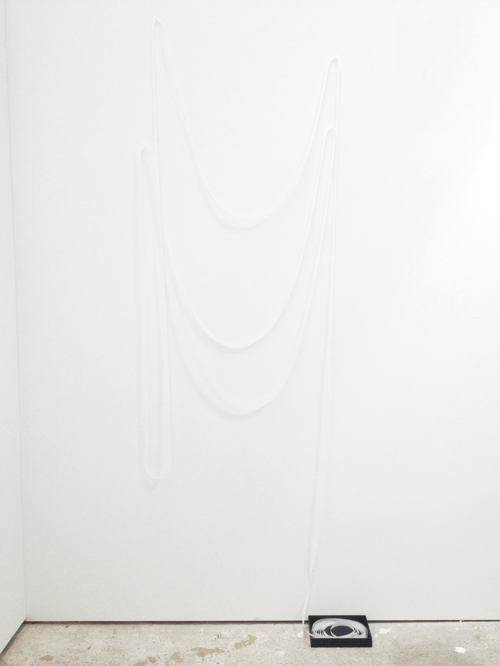 52 m, 35m, 21 m installation, calque transparent découpé en bandes, boîtes d’archivage, 2019 vues d’atelier et de l'exposition collective Des échos dans un jardin de pierre, Le Houloc, 2020 commissariat: Thomas Fort
